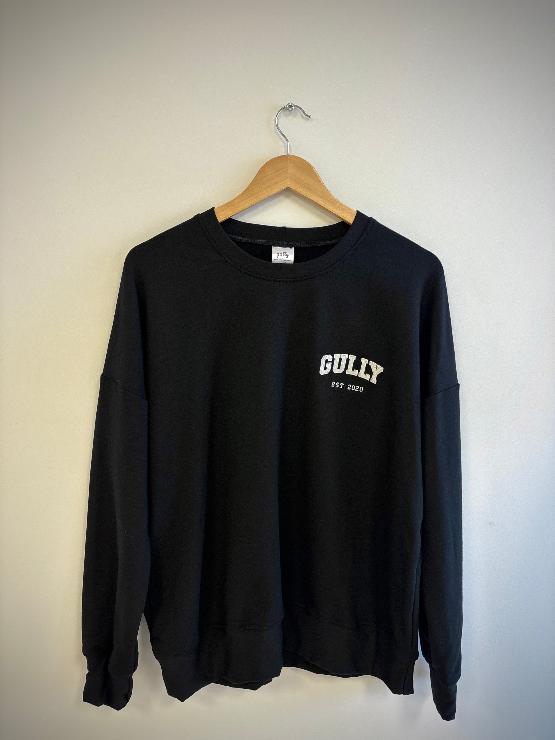 Black bamboo dream fleece featuring white embroidered Gully varsity logo